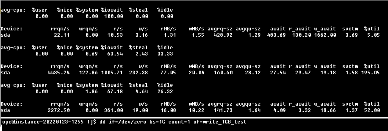 > 결과 1073741824 bytes (1.1 GB) copied, 96.283 s, 11.2 MB/s